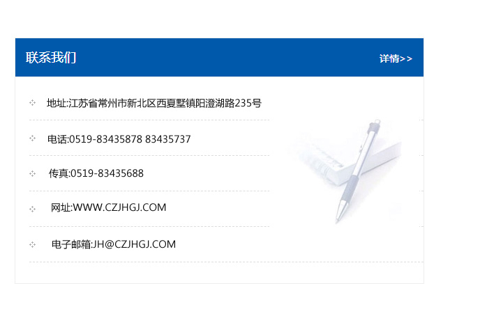 地址:常州市新北區友邦商務大廈1幢16、17層  電話:0519-85101652  傳真:0519-85112595  郵編:213022  網址:www.cz-jiayue_cn.youxianhaiyue.com  郵箱:xiajifengaa@163.com